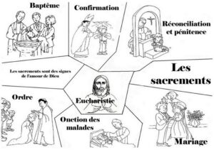 Les sacrements sont des signes visibles du don gratuit, la grâce de Dieu, institués par le Christ et confiés à l’Église. Par les sacrements, le croyant entre et participe à la vie divine. Les rites visibles (eau, imposition des mains, onction, hostie, …) sous lesquels les sacrements sont célébrés, signifient et réalisent les grâces propres, de chaque sacrement ( pardon de Dieu, vie de Dieu par le baptême, service des frères par l’ordination … ) L’Esprit Saint prépare aux sacrements par la Parole de Dieu. Les sacrements fortifient et expriment la foi, leur fruit, s’il est d’abord personnel contribue à la communion de toute l’Église « une âme qui s ‘élève, élève le monde » Il n’y a pas de christianisme sans la foi au Christ, le Fils de Dieu venu dans notre monde. Il n’y a pas non plus d’Église sans la célébration des sacrements, signes visibles de la grâce invisible. On peut certes être sauvé sans l’Église et ses sacrements, car Dieu veut le salut de tous les humains, et il rejoint les cœurs de bien des façons qui nous sont mystérieuses et souvent inconnues. Mais nous ne pouvons pas être chrétiens et chrétiennes sans l’Église et ses sacrements.