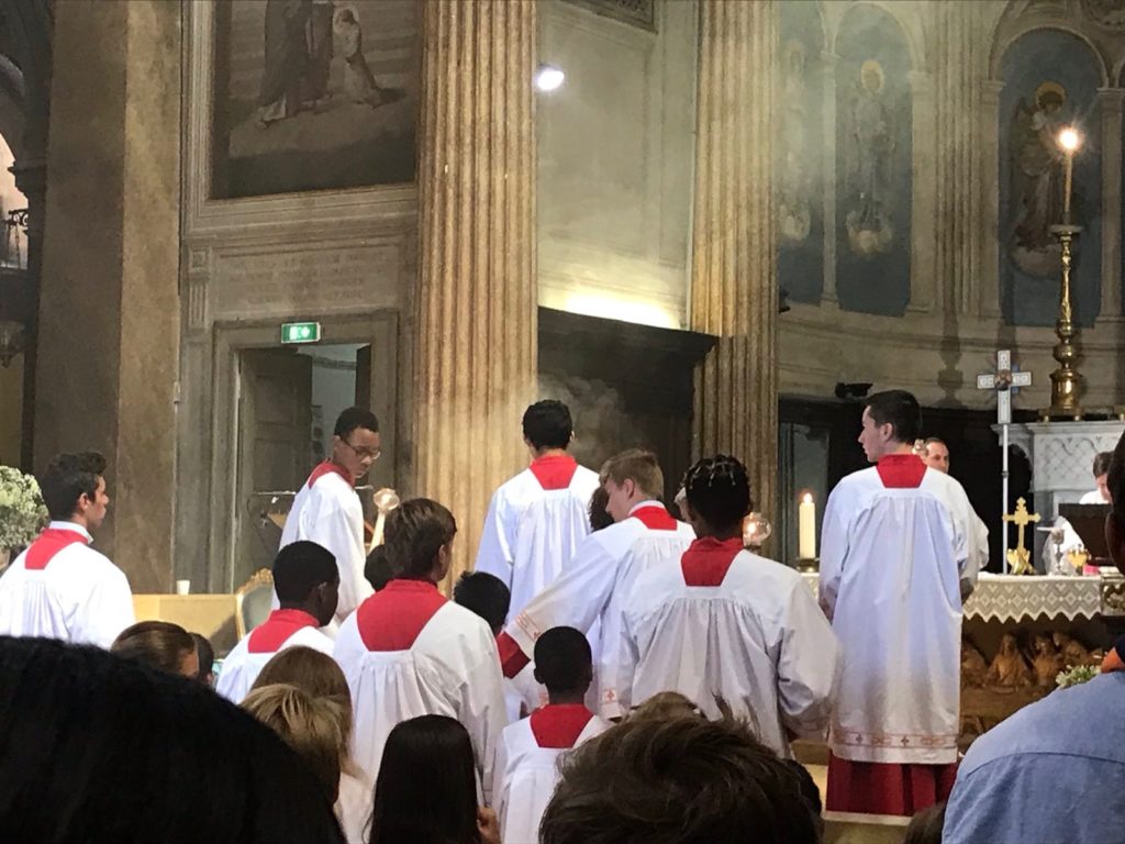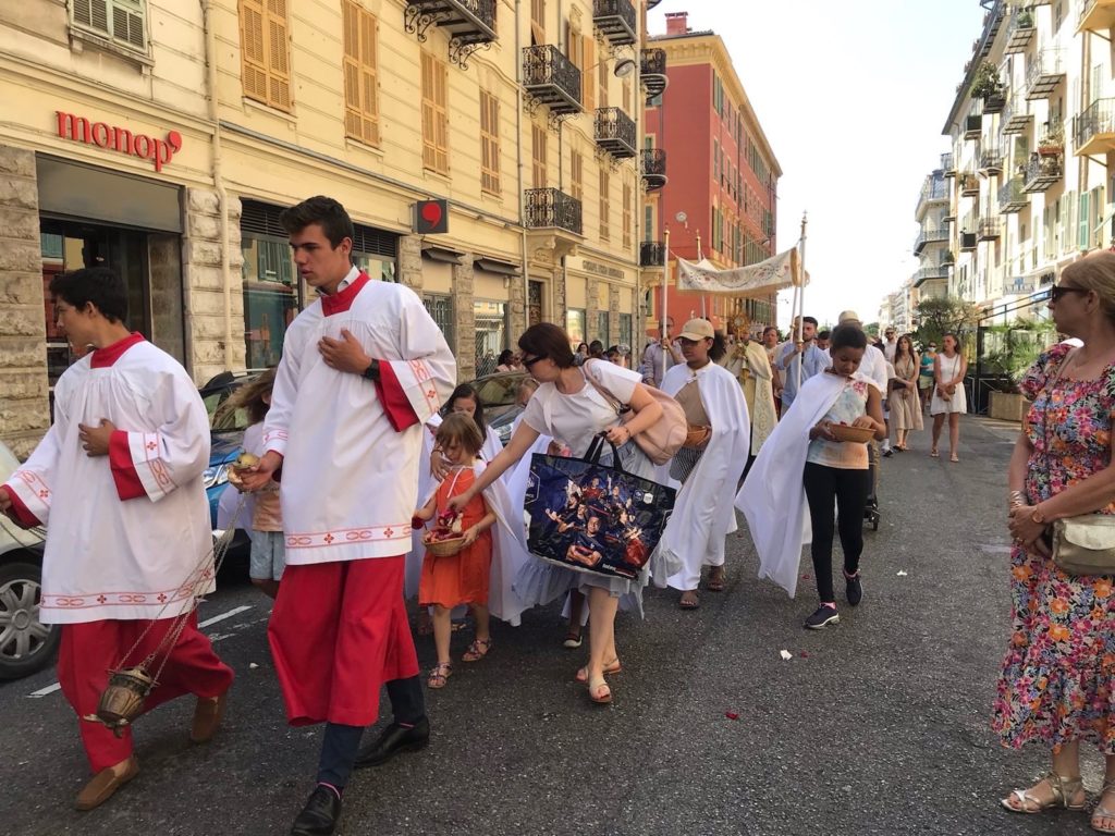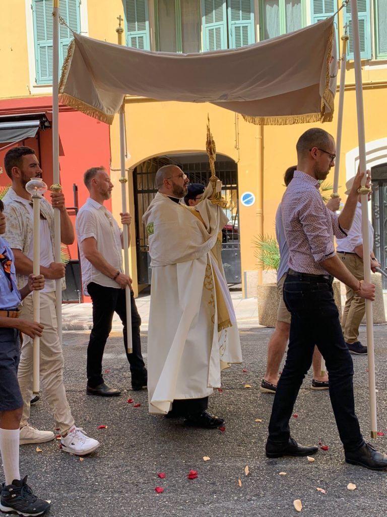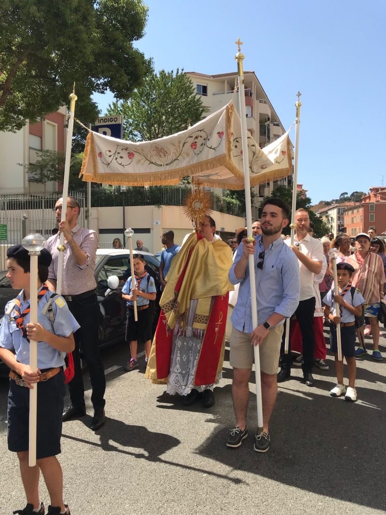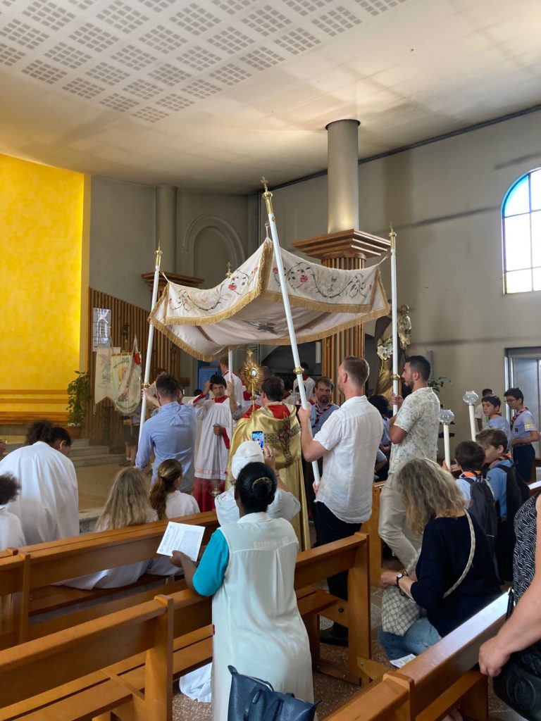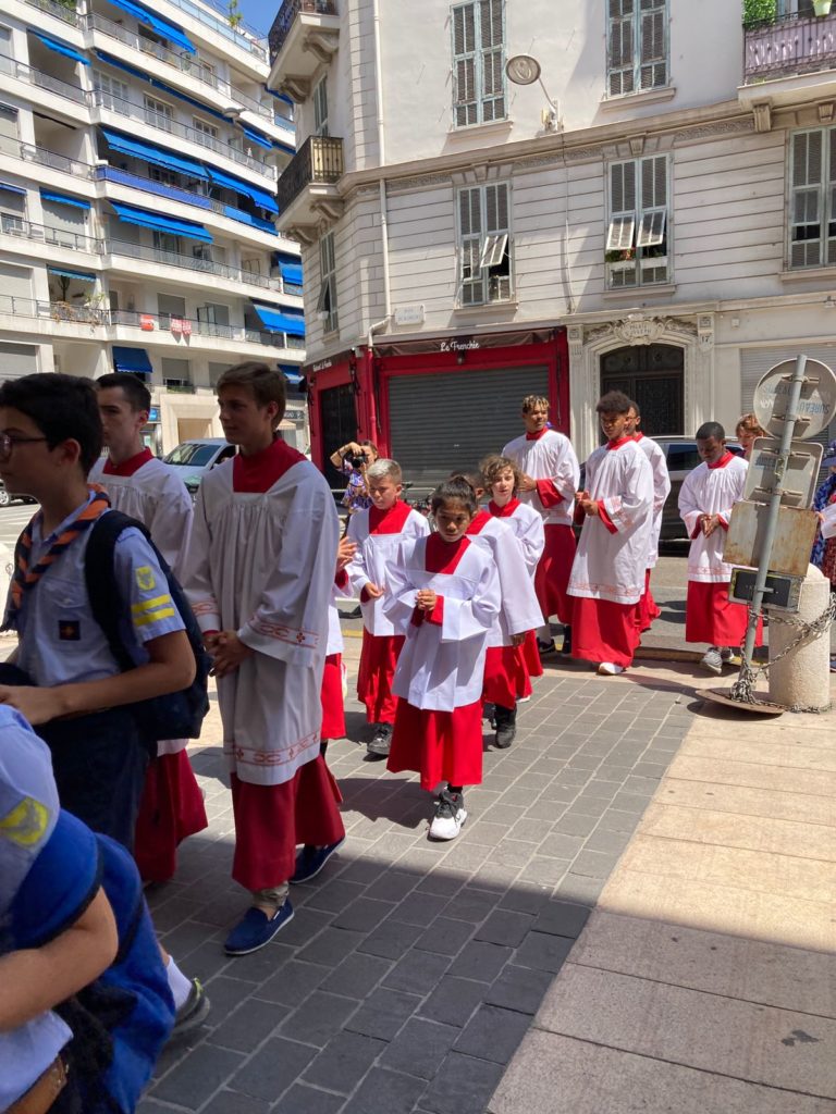 Cortège ouvert par les Scouts d’Europe, tous les servants de Messe, les enfants du catéchisme tapissant de fleurs le chemin reliant nos Eglises avant le passage d’un des Prêtres portant l’Ostensoir sous le Dais porté par 4 hommes ….