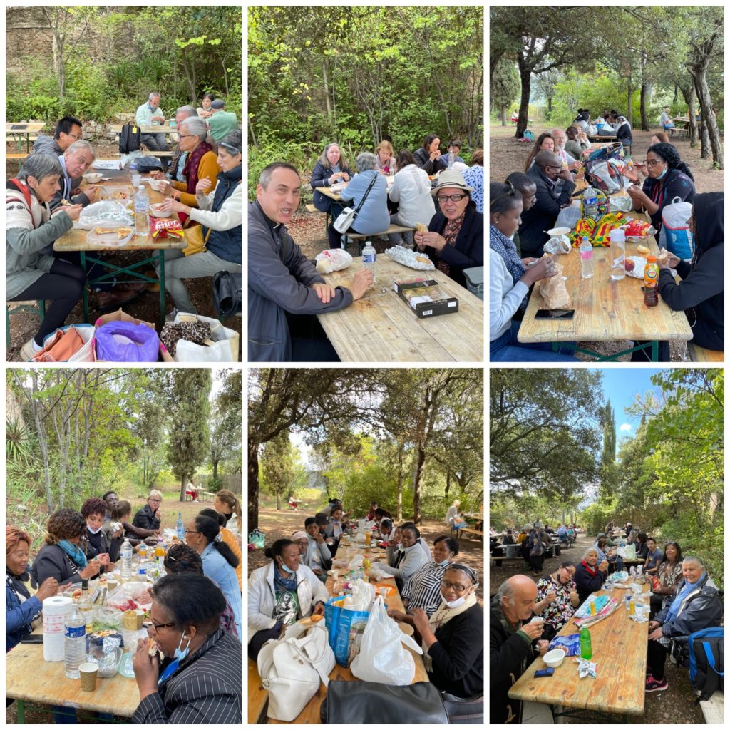 L’espace de la Sainte Famille, en extérieur, sous une pinède, nous est réservé pour la pause pique-nique avec des tables et des bancs. Il est agréable de se restaurer, de partager, d‘échanger, de voir les enfants jouer.